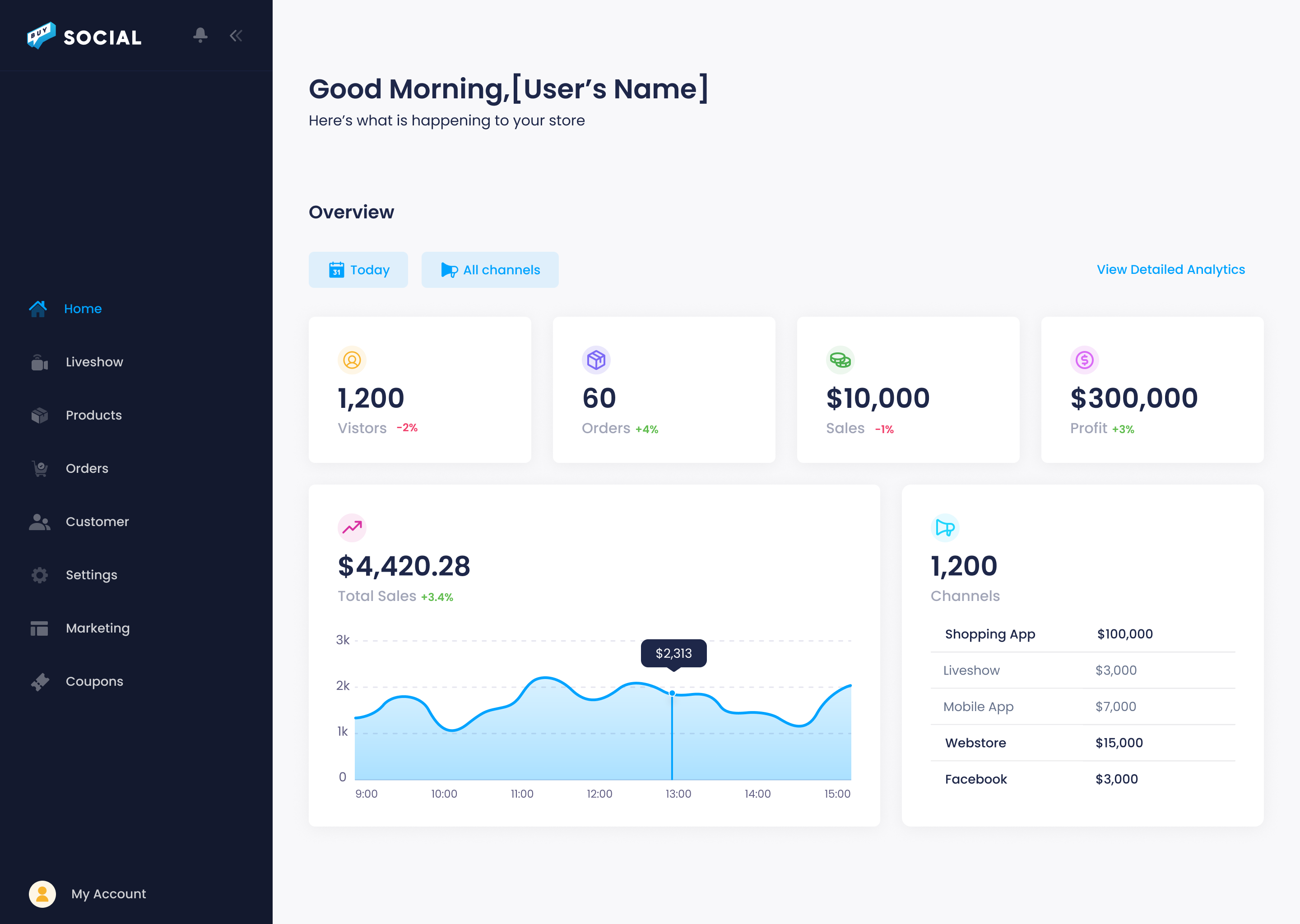 The moment you log into Buy Social, you see your key metrics: visitors, orders, sales, and profit with percentage changes. A total sales chart shows trends throughout the day, and a channel breakdown shows exactly how much revenue comes from your Shopping App, Liveshow, Mobile App, Webstore, and Facebook. Filter by date range and channel to drill into the numbers.