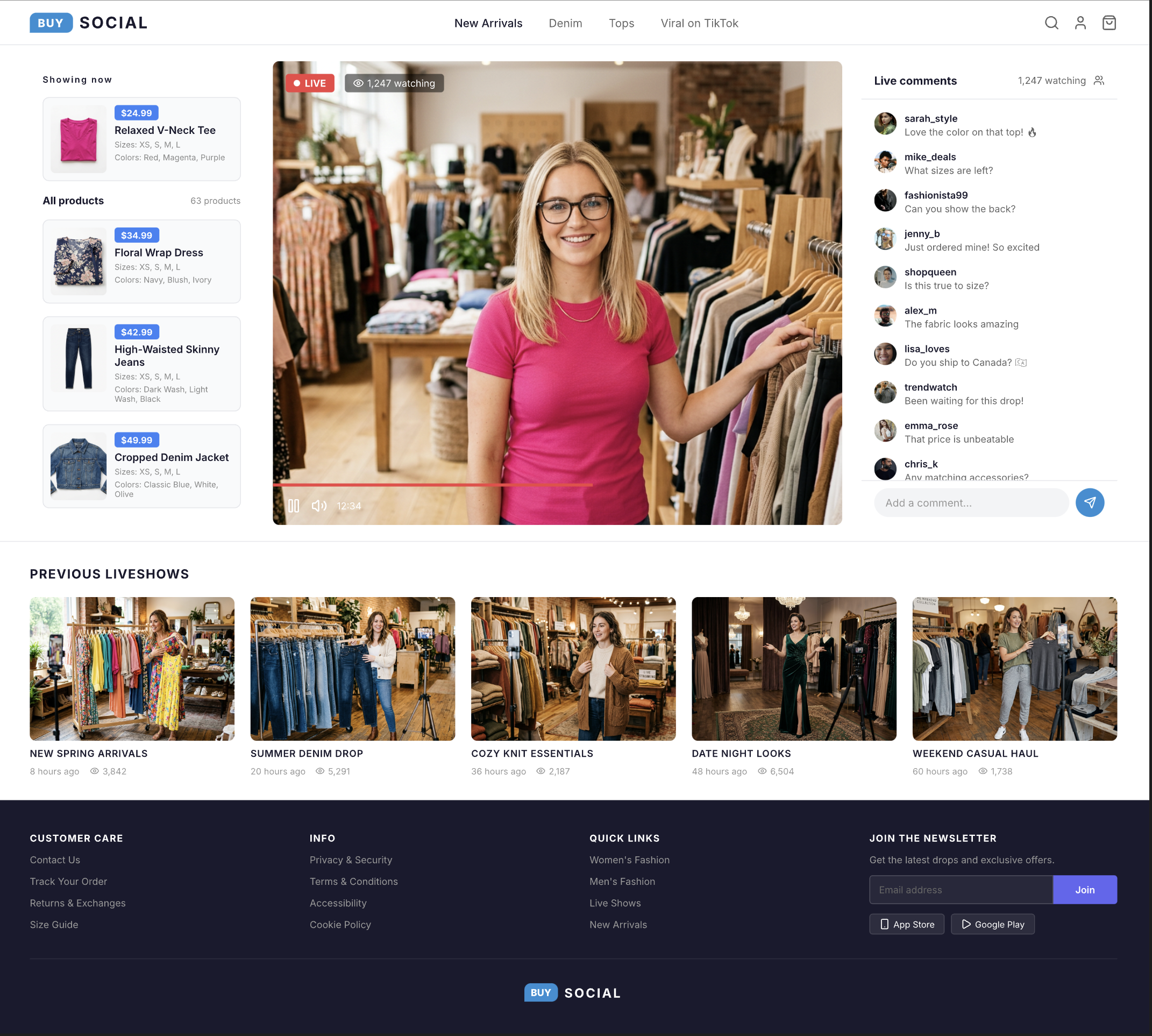 Your webstore shows the live stream front and center with your full product catalog on the left and live comments on the right. Viewers see 63 products, comment to buy, or click to add to cart. Previous live shows are available as replays below the stream so customers can shop even when you are not live.