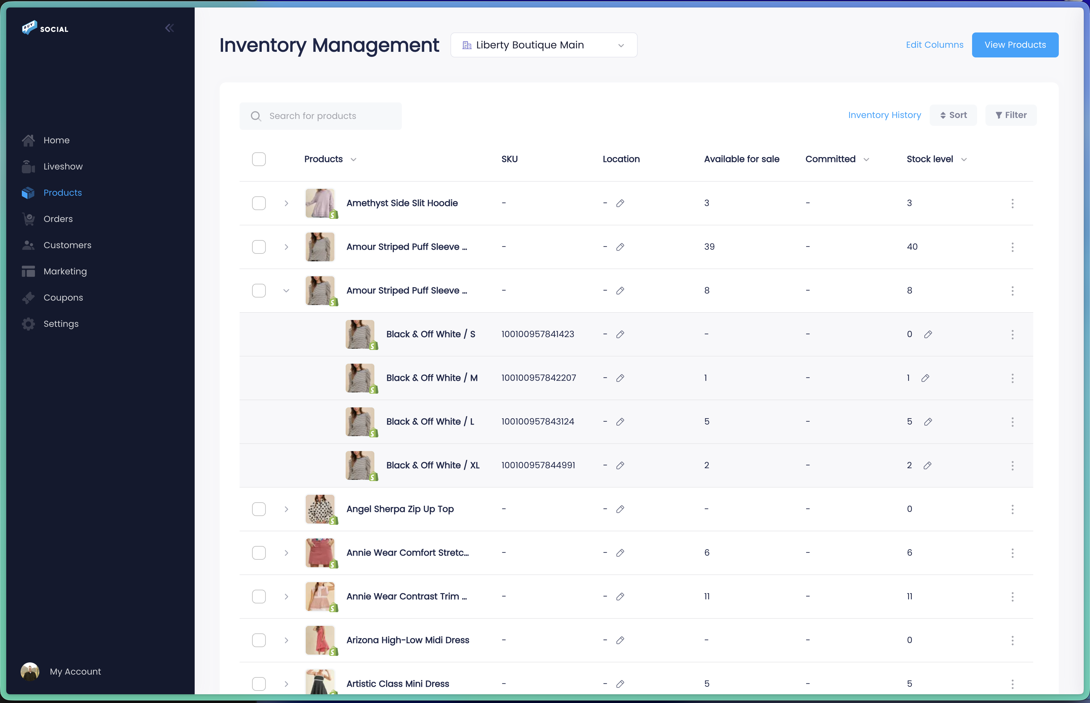 See available stock, committed inventory, and total stock levels for every product and variant. Expand any product to see inventory for each size and color combination. Adjust stock with a reason like stock received, re-count, damage, theft, loss, restock return, or giveaway.