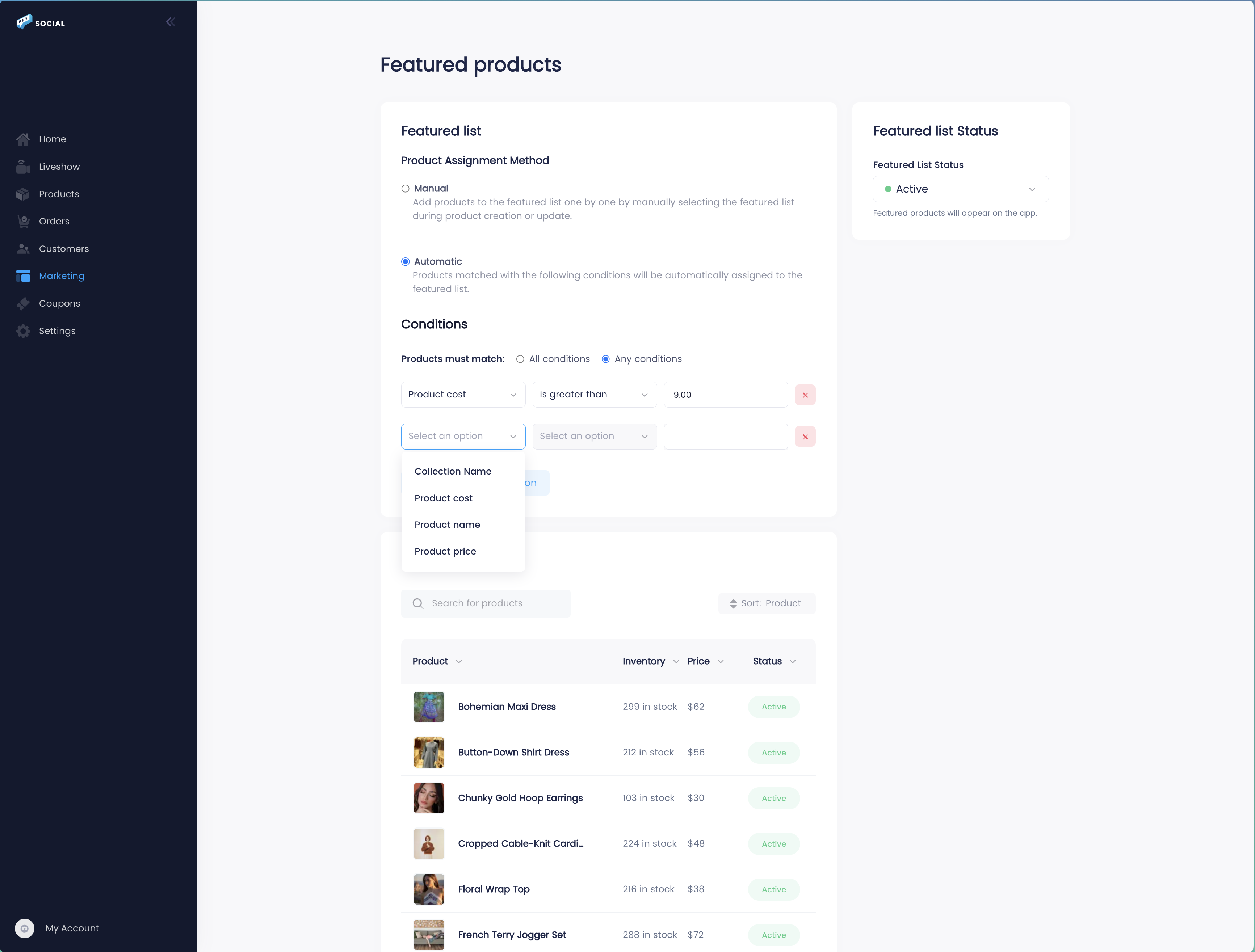 Switch from manual to automatic and set conditions for which products should be featured. Filter by product cost, product price, product name, or collection name. Match all conditions or any condition. When a new product is added to Buy Social that matches your rules, it is automatically added to the featured list. No manual updates needed.