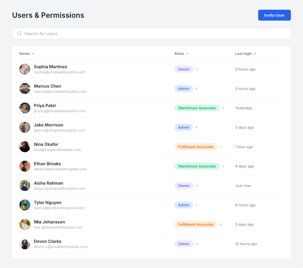 Each role has a clear scope. Your warehouse staff shouldn't see customer payment info, and your fulfillment associate doesn't need to edit product pricing.