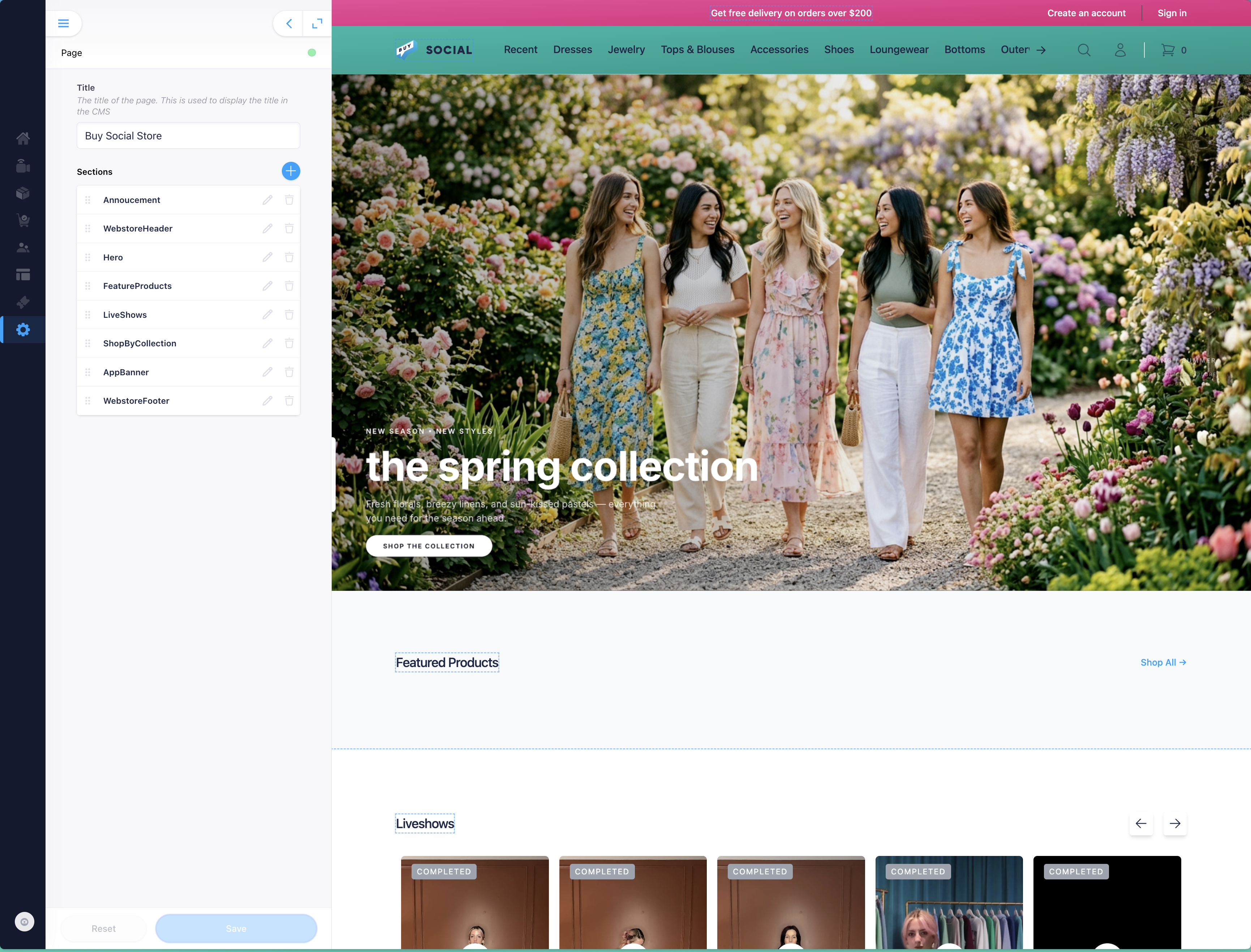 Build your homepage by adding, removing, and reordering sections. Choose from Announcement bars, Hero banners, Featured Products, Live Shows, Shop by Collection, App Banners, and more. Each section is editable with its own settings. Drag to reorder, click to customize, and hit Save when you are done.